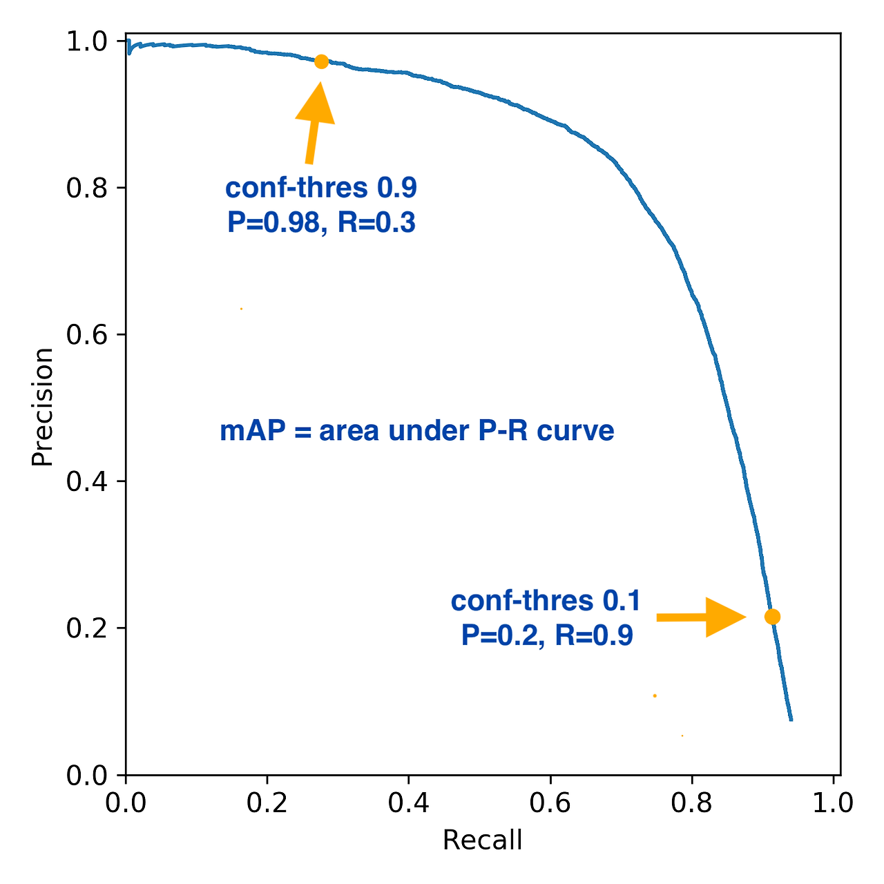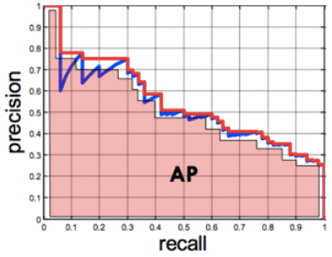 이렇게 구한 PR Curve의 아래쪽 면적을 `AP`:Average Precision이라고 부르며 모델의 성능을 정략적으로 평가하고자 하는 수치이다. 모든 클래스에 대한 AP의 평균을 `mAP`: Mean Average Precision이라고 부른다.