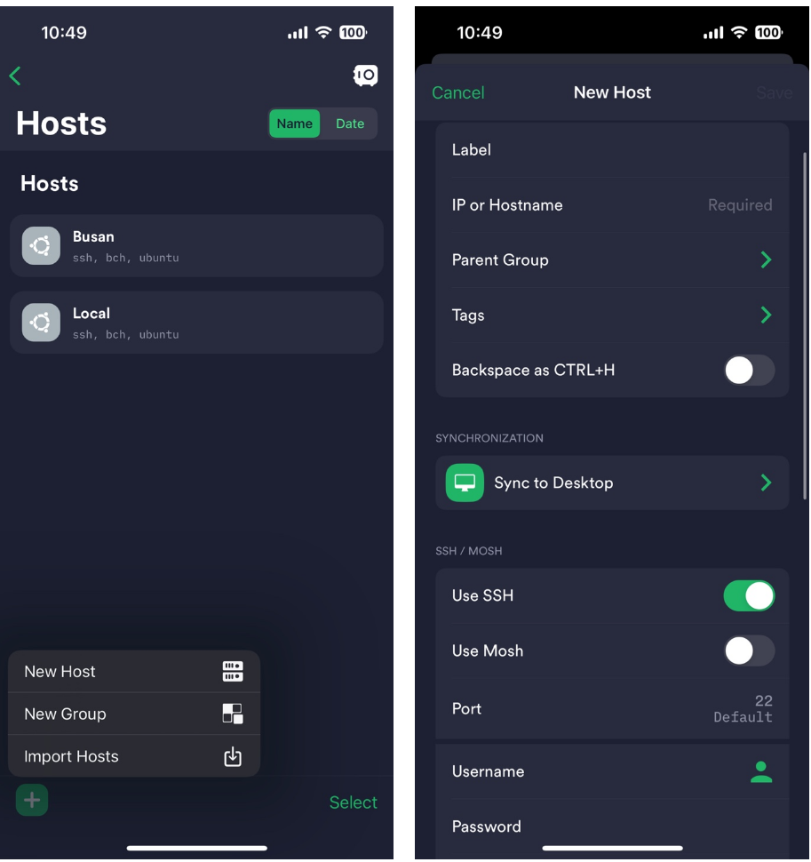 그런다음 New Host를 클릭하여하던 대로 `ip`,`port`,'username`,`password` 등을 적어주면 된다. 끝!