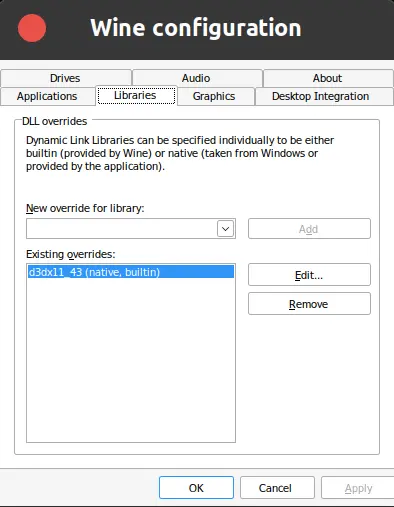 2. `Libraries > New Override for Library`에 `dxd11_43`을 추가해준다.