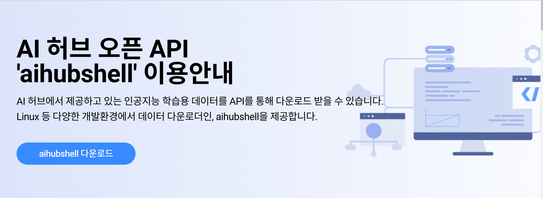 AI 허브 오픈 API'aihubshell' 이용안내 AI 허브에서 제공하고 있는 인공지능 학습용 데이터를 API를 통해 다운로드 받을 수 있습니다. Linux 등 다양한 개발환경에서 데이터 다운로더인, aihubshell을 제공