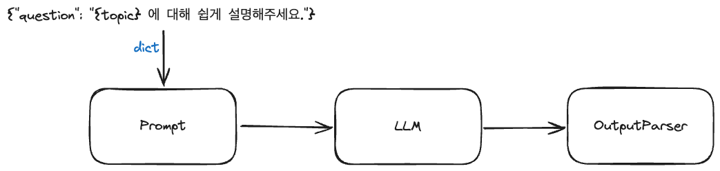 가장 일반적인 사용법으로, prompt와 모델을 연결하여 출력하는 방식으로 f-string 형태로, 변수를 `{}`로 감싸서 입력을 넣어주면 된다.