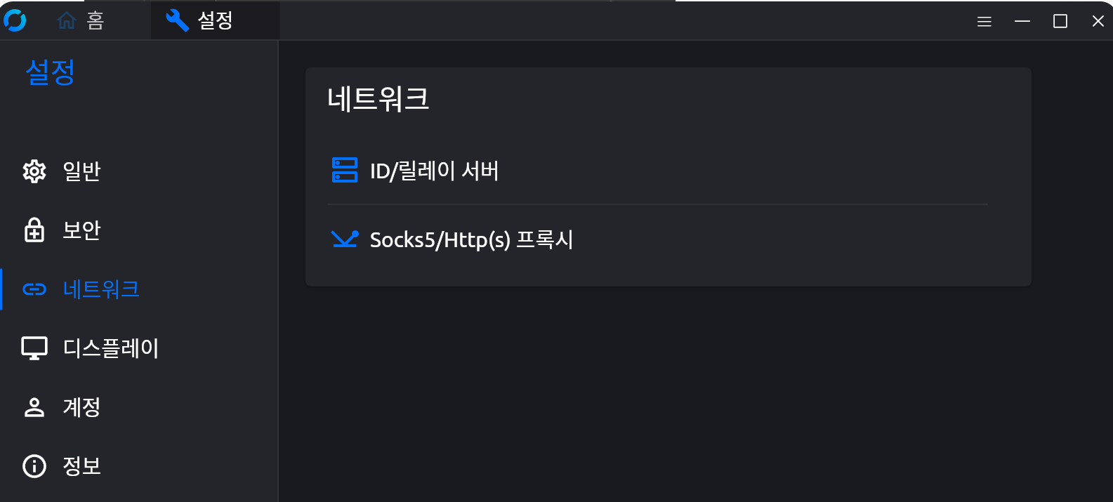 이제 RustDeSK 클라이언트를 열어주고 설정->네트워크->ID/릴레이서버에 들어가 준다.