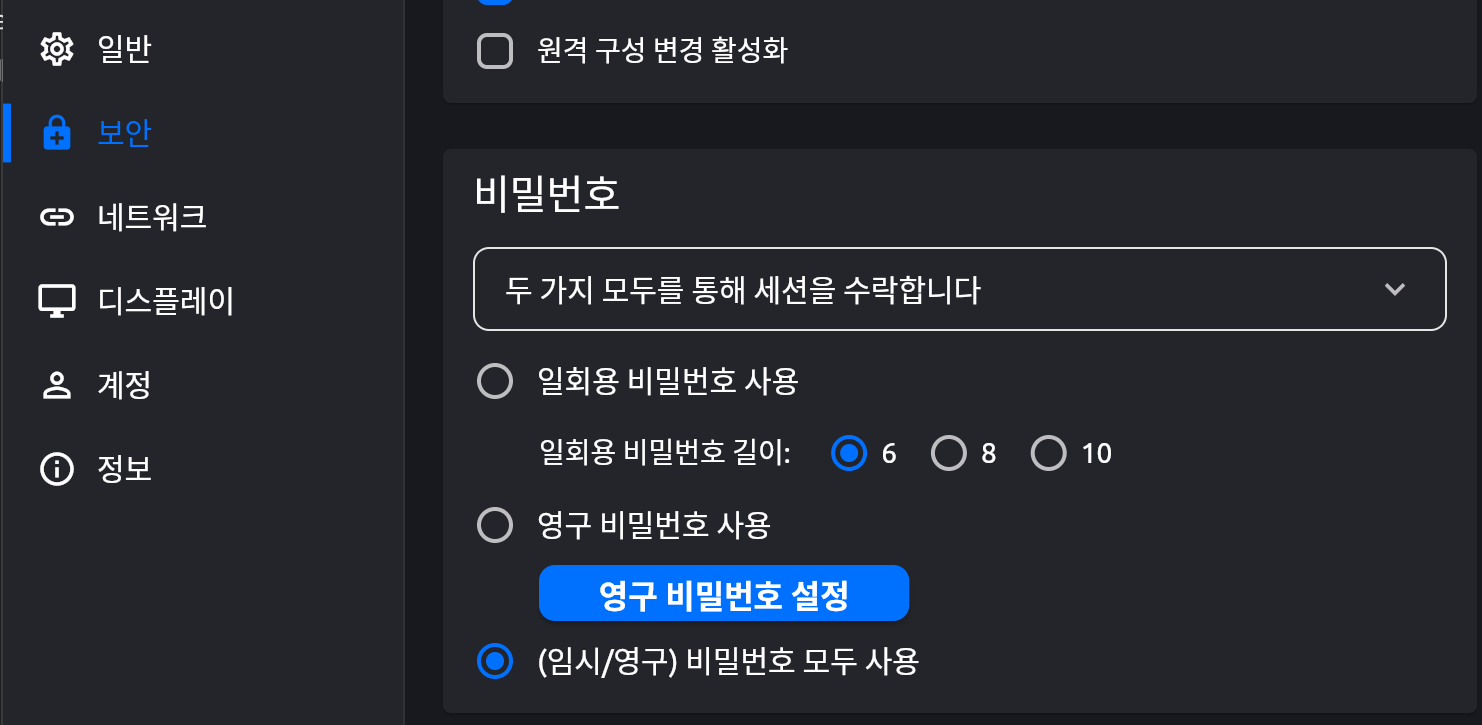 설정->보안에 들어가서 아래의 비밀번호 탭에서 영구 비밀번호 설정을 눌러서 영구 비밀번호 설정을 해두고, 실제로 선택은 (임시/영구) 비밀번호 모두 사용으로 해두는 것을 권장한다.
