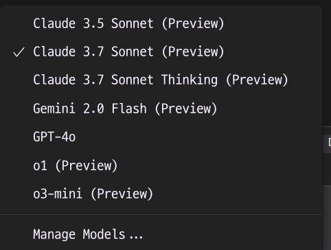 즉 왼쪽에 있는 모델들은 github copilot을 결제하면 기본적으로 사용가능한 모델들이고 우측은 자신이 추가로 api를 이용하여 사용할 수 있는 모델이다.