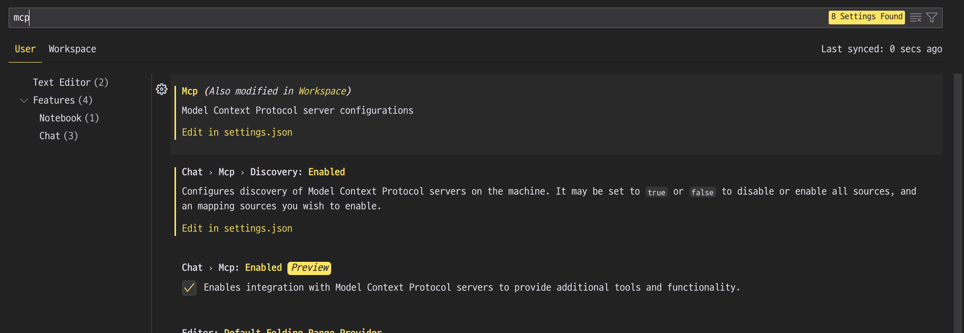 1. VS Code 설정에서 mcp를 검색하여 해당 설정을 켜준다