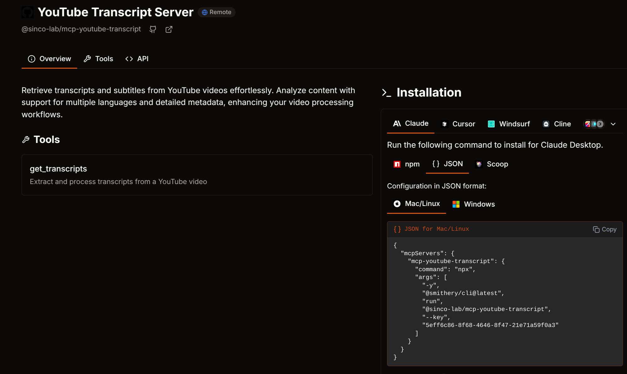 Smitery에서 원하는 mcp server을 찾아서 누르면 친절하게 json을 제공해 준다.