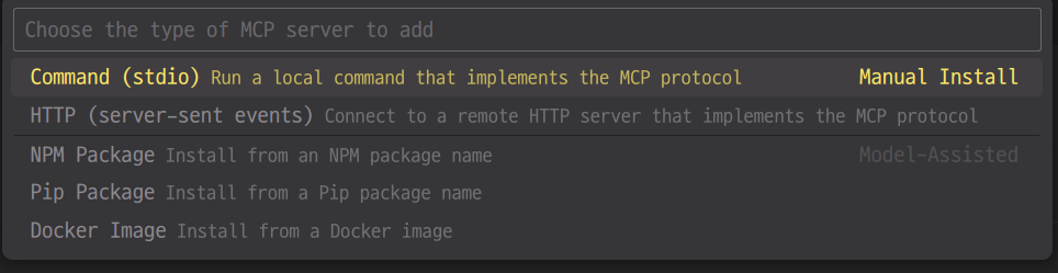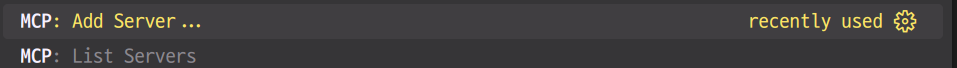 위처럼 settings.json에 붙여 넣는 식 말고 vscode의 명령 팔레트(Ctrl+Shift+P)에서 MCP: Add Server를 실행하여 추가할 수도 있다. 아래 이미지에서처럼 원하는 방식으로 동일하게 smithery에서 커맨드를 복사하여 붙여 넣어주면 된다.