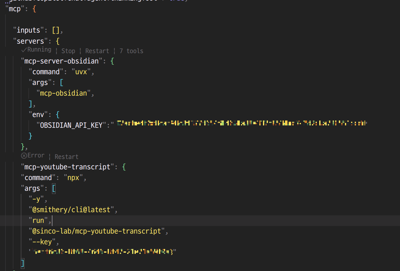 저 json 포맷을 복사하여, 아까 vscode의 setting.json을 열어서 mcp 부분에 붙여 넣기 해주면 끝이다. 위에 `inputs`와 `servers`부분은 건드리지 말고 servers안에 자신이 원하는 mcp서버 json들을 붙여 넣어주면 된다.(해당 MCP서버 이름부터 복사해 주면 된다. 위의 예시에서는 `mcp-youtube-transcript`)