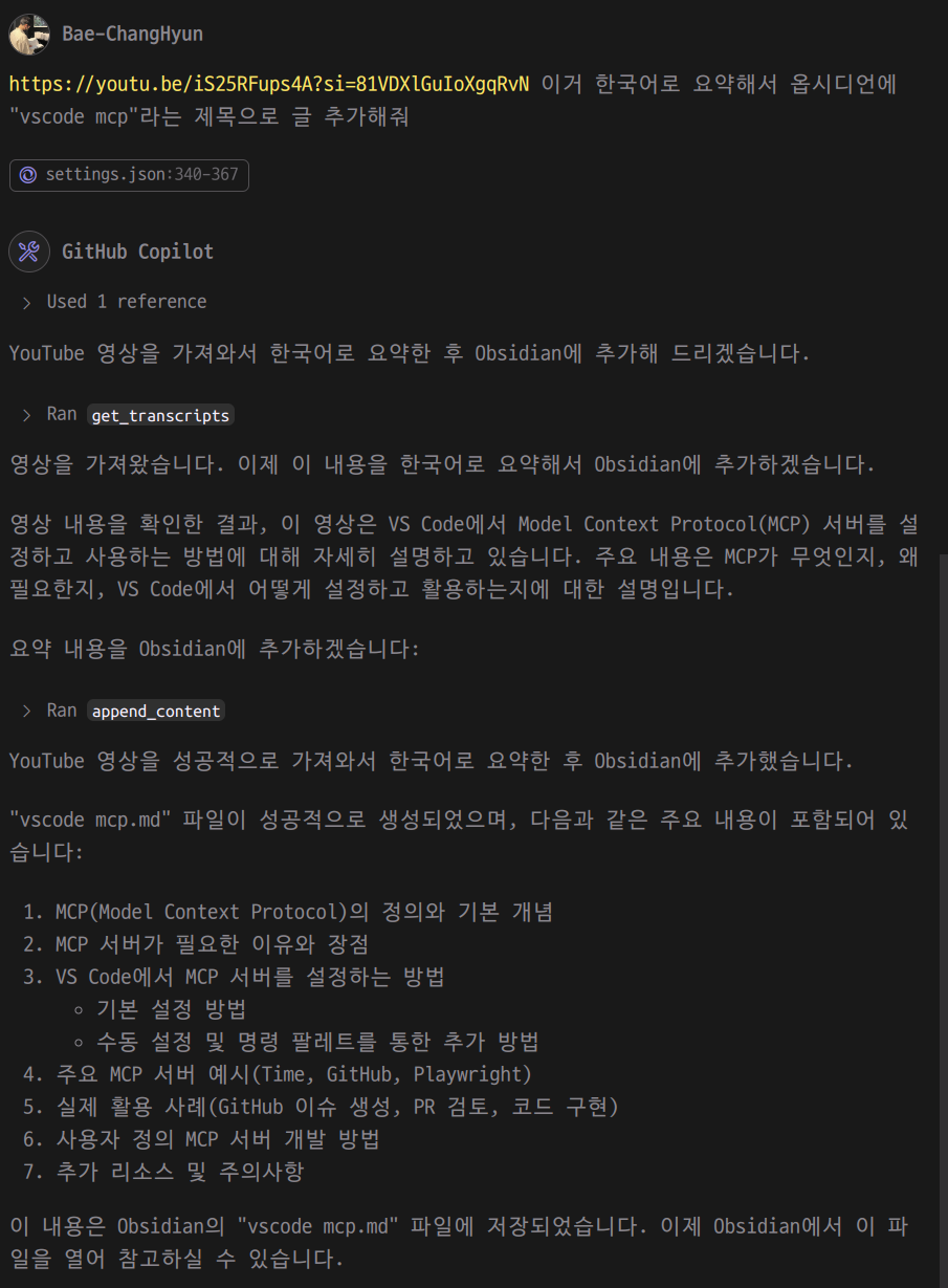 나는 `유튜브요약`과 `옵시디언` mcp 서버를 추가하였고 이를 활용해서 유튜브를 요약해서 옵시디언에 노트를 추가하도록 시켜봤다. 실제로 옵시디언에도 해당 노트가 잘 추가되는 것을 볼 수 있다.!!!!!!!!!!! 회사에서 지원해준 github copilot을 더욱 유용하게 쓸 수 있게 되었다.