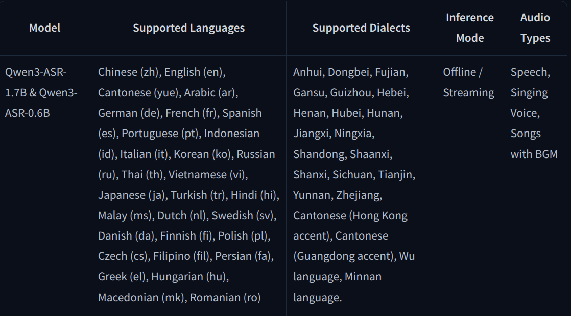 - Qwen3-ASR-1.7B: 성능 위주 버전, 오픈소스 중 최고 수준