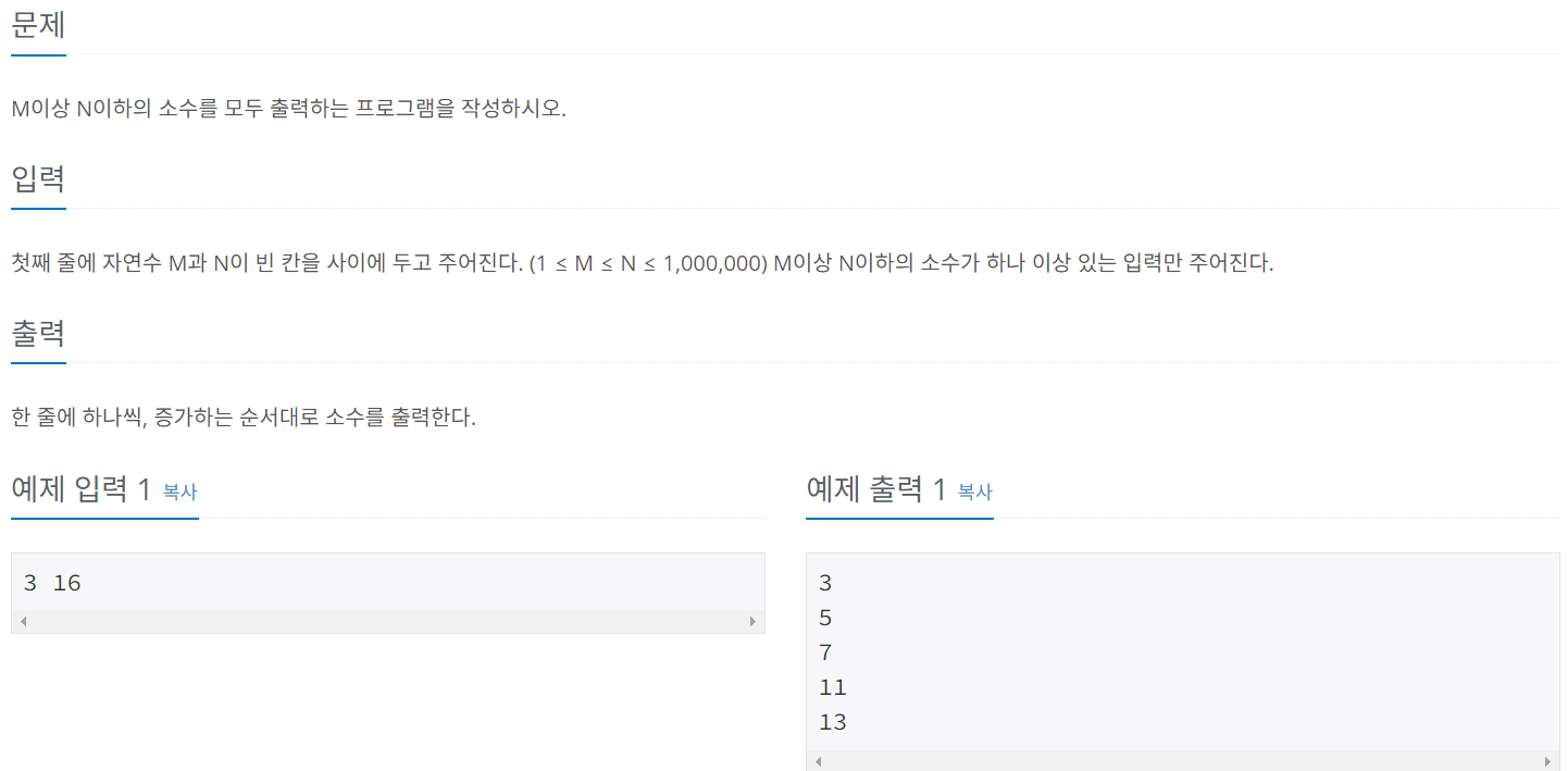 첫째 줄에 자연수 M과 N이 빈 칸을 사이에 두고 주어진다. (1 ≤ M ≤ N ≤ 1,000,000) M이상 N이하의 소수가 하나 이상 있는 입력만 주어진다.